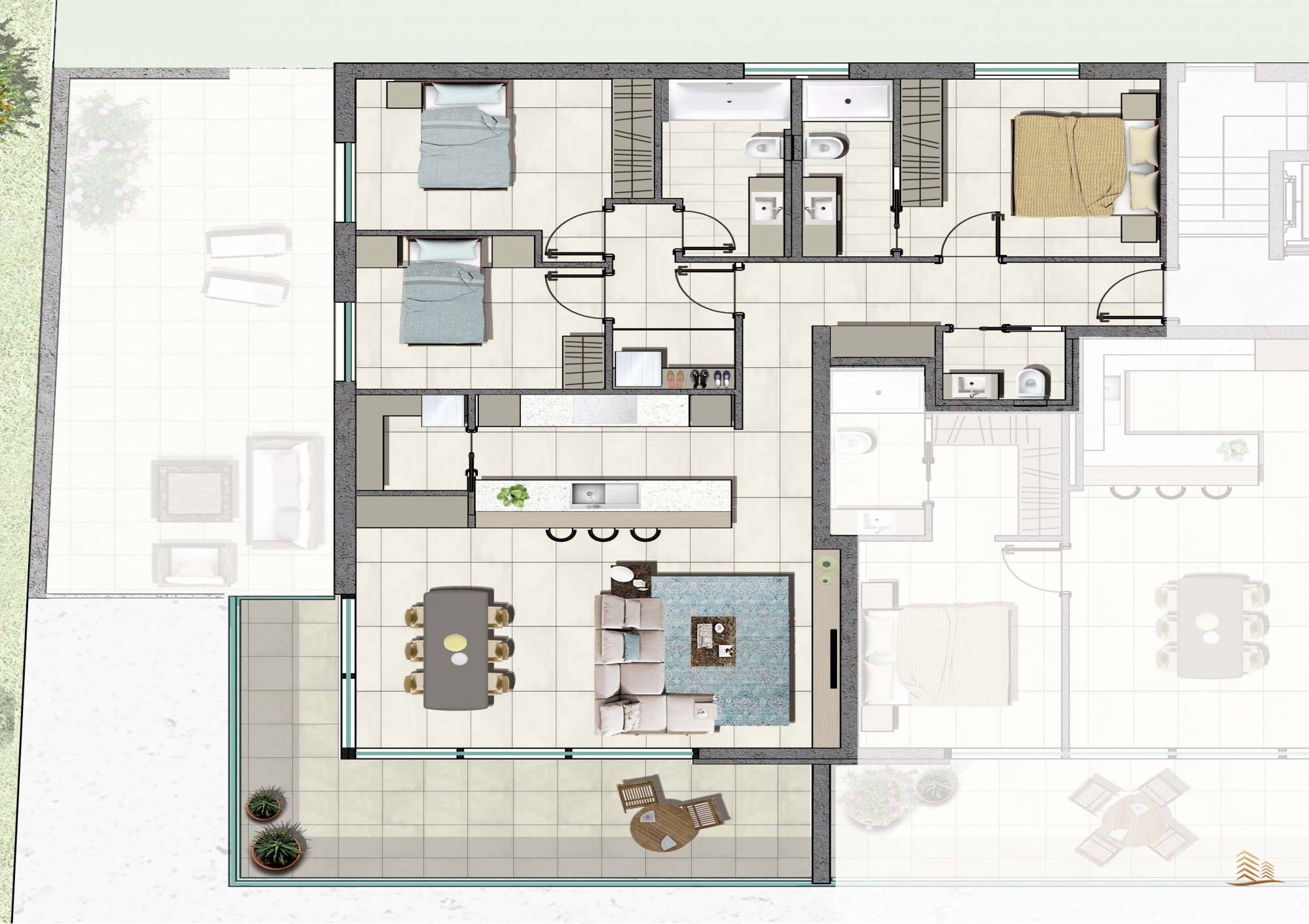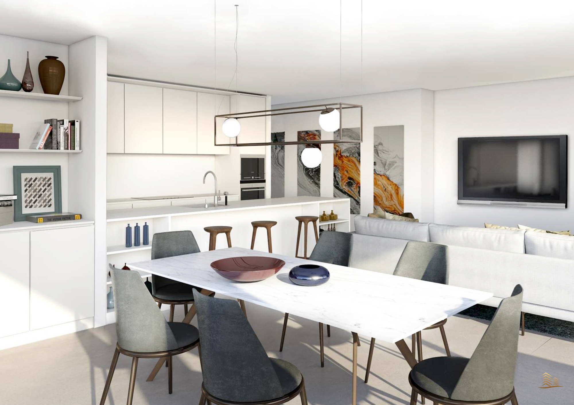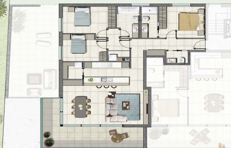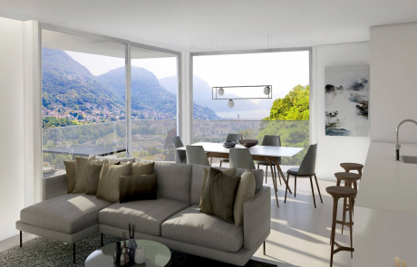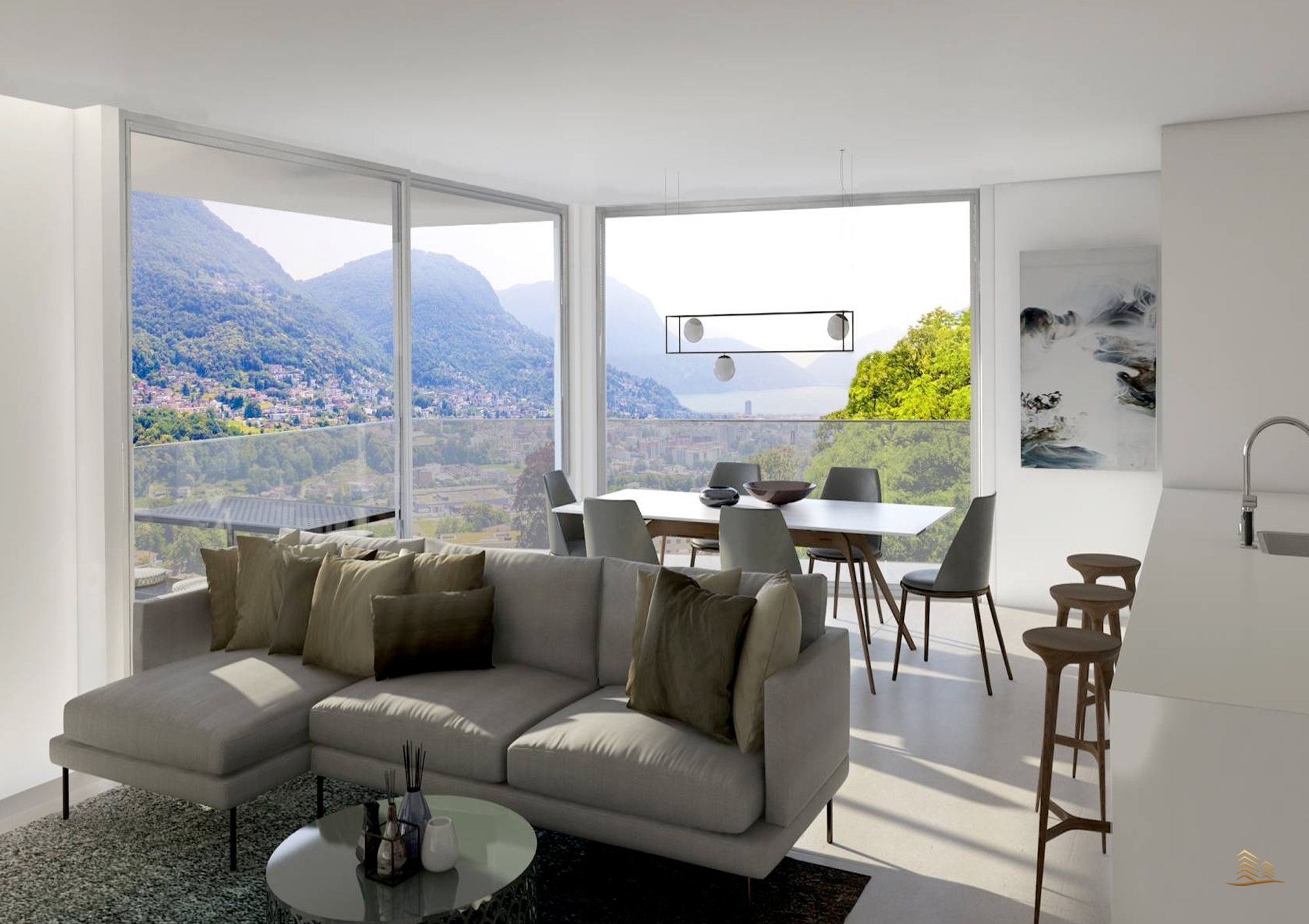 La vista mozzafiato dalla zona del soggiorno/pranzo fa dell’appartamento numero cinque, situato all’ultimo piano, un attico 4 ½ veramente speciale. Il generoso spazio giorno di 51 m2 con l’esposizione verso sud e la sua vetrata scorrevole ad angolo di 8.5 ml incornicia lo spettacolare panorama del Monte Brè e il lago di Lugano. Una suite matrimoniale con un bagno privato, una zona notte con 2 camere da letto, una cucina aperta con il suo ripostiglio, tripli servizi e una lavanderia/ripostiglio completano questo grande appartamento di 123 m2 SUL. Tutte le finiture interne sono personalizzabili e la distribuzione interna può essere modificata secondo le proprie esigenze.