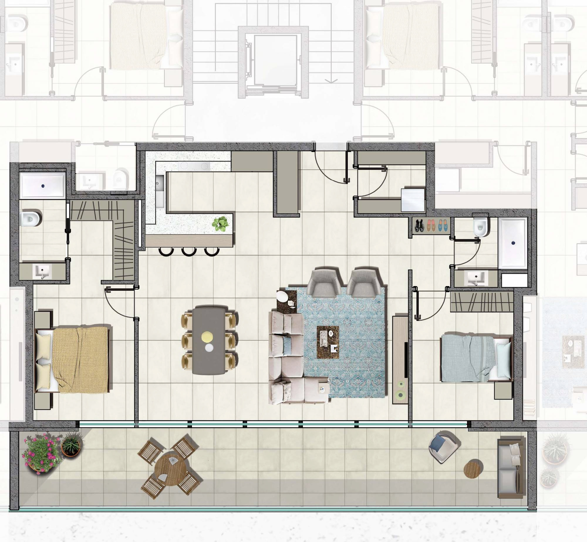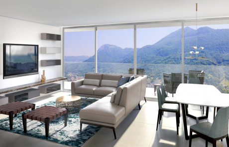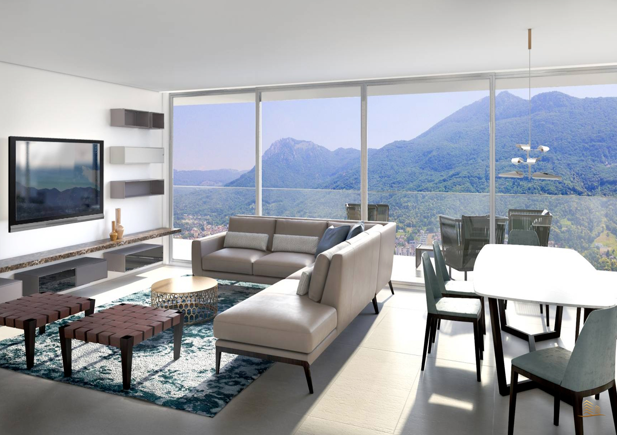 Situato all’ultimo piano, l’appartamento numero 6 è un moderno attico 3½ di 108 m2 SUL con un grandissimo spazio giorno di 58 m2 e una fantastica vetrata scorrevole di 8 ml che incornicia come un quadro la spettacolare vista a 180° sul Monte Brè, Monte Boglia e i Denti della Vecchia: e’ come avere un soggiorno/pranzo all’esterno. La stessa vista si apre da entrambe le camere da letto e dalla spaziosa terrazza di 33 m2. Una grande cucina aperta con un suo ripostiglio, doppi servizi e una lavanderia/deposito completano questo straordinario appartamento. Tutte le finiture interne sono personalizzabili e la distribuzione interna può essere modificata secondo le proprie esigenze.